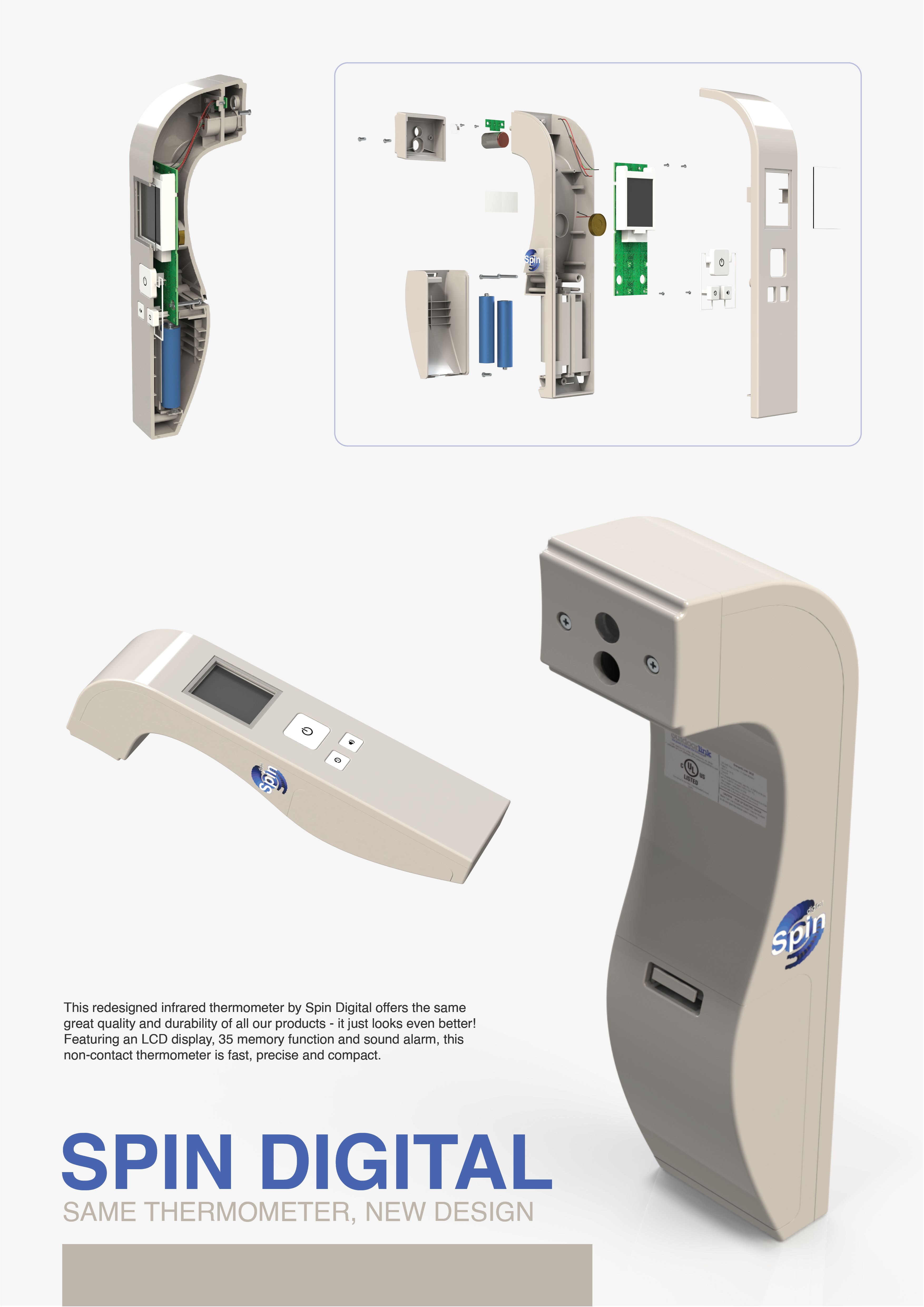 The original purchased digital infrared thermometer vs. the rebranded and redesigned Spin Digital thermometer.
