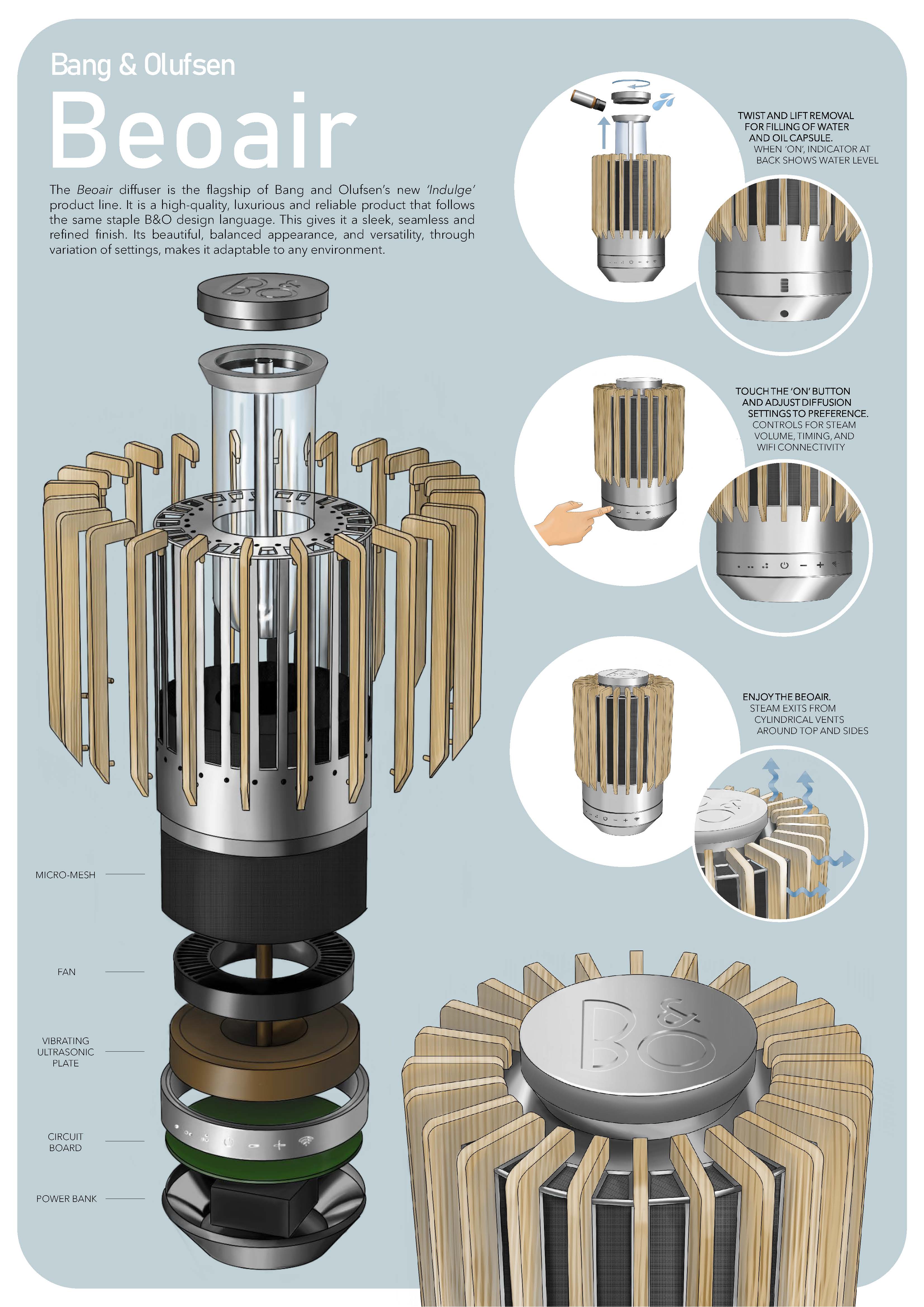 In this case, I analysed the design language commonly used by Bang & Olufsen in its products, and then applied it to create a diffuser – a new product line that could be produced and sold by the well known, high-quality brand.
